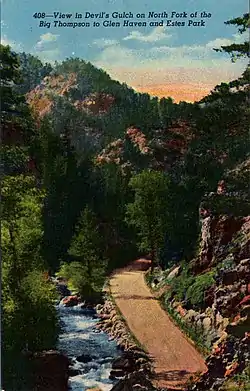 The North Fork Big Thompson River is a 22.7-mile-long (36.5 km)[2] tributary of the Big Thompson River in Larimer County, Colorado. The river's source is Rowe Glacier on the north slope of Hagues Peak, in the Mummy Range of Rocky Mountain National Park. It flows through Lake Dunraven, over Lost Falls and through Glen Haven before a confluence with the Big Thompson in Drake.