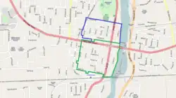 Location of the North Geneva Historic District (blue outline) within Geneva. The adjacent Central Geneva Historic District is outlined in green to the south, partially sharing a border north of W. State St.