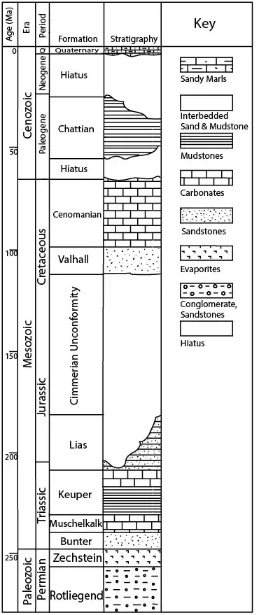 • In the Late Upper Triassic to the Lower Jurassic, the Lias Unit is composed of sandstone, shale, limestone, and clay. This unit was deposited between 200- 180 Ma, though is particularly difficult to define a thickness due to a large hiatus, which occurs above this unit. This pause in deposition, the late Cimmerian Unconformity lasted until the Middle Cretaceous approximately 110 Ma.[18][19]