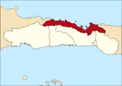 North Gorontalo (Gorontalo Utara) is a regency of Gorontalo Province, Indonesia, stretching along the entire northern coast of the province. It is located on the northern peninsula of the island of Sulawesi. It was established in 2007 under Law Number (Undang-Undang Nomor) 11/2007 from the former northern districts of Gorontalo Regency. The new regency has an area of 1,777.02 km2, and it had a population of 104,133 at the 2010 Census[2] and 124,957 at the 2020 Census;[3] the official estimate as at mid 2022 was 128,563 (comprising 65,615 males and 62,948 females).[1] Its regency seat is the town of Moluo in Kwandang District.