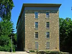 North Hall was opened at the University of Wisconsin on September 17, 1851, as the North Dormitory. The sandstone building, which cost $19,000, was typical to educational buildings of the era. The four-story building is rectangular, has a hipped roof, and features little decoration. The east and west facades have ten bays; the center four project slightly beyond the other six. Single-door entrances are found on these facades near the ends. A plain yet deep cornice decorates the roofline. Windows and doors have plain lintel blocks and eight interior chimneys protrude from the roof.[3]
