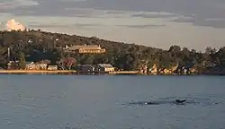 ![]() The hospital, boiler house and wharf at the Quarantine Station, with humpback whales passing by | |