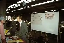 NJRCA members Donald Barnickel (foreground) and Charles Walsh (background) answer questions at NJ Transit's Hoboken Festival in October, 1987.