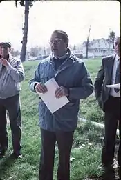New Jersey State Senator Thomas Gagliano (R-Middlesex) speaks at Netcong Station in May 1988 prior to the New Jersey State Railroad & Transportation Museum Commission boarding an excursion train for Dover, NJ and return. Also in the photo are Morris County Freeholder Patrick Hyland (right) and Frelinghuysen Township, New Jersey Mayor Charles Rydell (left).