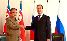 North Korea–Russia relations (Korean: 로씨야련방-조선민주주의인민공화국관계; Russian: Российско-северокорейские отношения) are the bilateral relations between Russia and North Korea. The Soviet Union (Union of Soviet Socialist Republics, USSR, the predecessor state to the Russian Federation) was the first to recognize North Korea (Democratic People's Republic of Korea, DPRK) on October 12, 1948, shortly after the proclamation, as the sole legitimate authority in all of Korea. The Soviet Union supported North Korea during the Korean War. North Korea was founded as part of the Communist bloc, and received major Soviet military and political support.[1] The comprehensive personality cult around North Korea's ruling family was heavily influenced by Stalinism. China and the Soviet Union competed for influence in North Korea during the Sino-Soviet split in the 1960s, as North Korea tried to maintain good relations with both countries.[2]