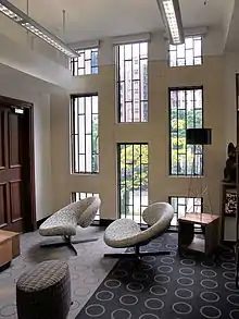 On its front facade, there are central projecting bay, symmetrical tall and narrow windows. Tiled apron panels can be seen. The external wall is mostly grey with blue canopies. A central light well was constructed spanning the third to the fifth floor.