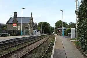 The platforms heights here are low and wooden boarding steps were provided on both platforms for many years – easy access ramps have now been fitted to improve accessibility on each side. Shelters are provided on both platforms, along with digital CIS displays a pay phone and timetable posters to offer train running information. The platforms are linked via a barrow crossing, so mobility-impaired and wheelchair users are advised not to use this without assistance.[6]