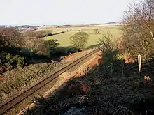 Starting from Sheringham station, the lines follows the coast westwards, soon passing over the Automatic Open Crossing at Sweetbriar Lane, where the private road leading to Sheringham Golf Club crosses the line.[36] The line climbs a 1 in 97 gradient, with the golf course, and Skelding Hill,[37] on the seaward side of trains, while the A149 can be seen on the landward side of trains, roughly paralleling the tracks with Upper Sheringham visible in the distance. During WW2, Skelding Hill was the location for an emergency coastal battery, complete with an underground headquarters bunker.[38]