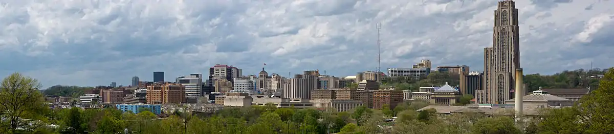 The University of Pittsburgh's Cathedral of Learning (right) dominates Oakland's skyline.