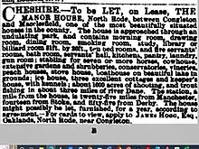 George Percival Daintry had returned to North Rode from Canada when he turned 21 in 1892.[12] He appears to have run the estate until he inherited it in 1899. In 1902 he married Dorothy Ridgeway who was the daughter of John Ridgway of Sutton Hall, Cheshire.[13] The couple had four children. The family did not live in the Manor and preferred to rent it to wealthy tenants. They usually lived at Oaklands which was also on the estate. A rental advertisement for the manor is shown.