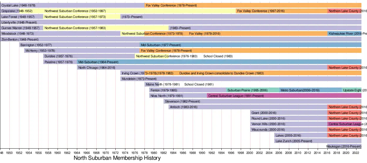Founded in 1948, seven schools located in the northern suburbs of Chicago banded together to create the North Suburban Conference, not to be confused with the Northwest Suburban Conference which was formed in 1925. The original members included Crystal Lake, Grayslake, Lake Forest, Libertyville, Gurnee Warren, Woodstock and Zion-Benton. In 1952, Grayslake and Barrington would switch conferences with Grayslake heading to the Northwest Suburban and Barrington joining the North Suburban. In 1953, McHenry joined the league and Dundee entered in 1957. In the same year, Lake Forest and Gurnee Warren would leave and join the Northwest Suburban. Similar to the previous mentioned switch, Palatine would join the conference from the Northwest Suburban, also in 1957 but eventually leave for the Tri County Conference in 1964. To replace Palatine, North Chicago left the Tri County to join the North Suburban, also in 1964.