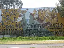 The mural was proposed for inclusion on the Darebin Heritage Overlay in 2011.[4] The Mural represents Victoria's Aboriginal culture and history and contains strong political statements about the incarceration of Aboriginal people[5] Among other elements, it depicts large-scale renderings of historical artworks by Tommy McRae and William Barak, a representation of Aboriginal men manacled in neck chains taken from a well known photograph, and the Lake Tyers land rights campaign of the 1970s.[6]