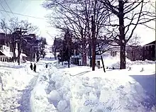 Boston and Providence recorded all-time highs for 24-hour and storm snowfall.[3] Many people were left without heat, water, food, and electricity for over a week after the storm finished. Approximately 10,000 people moved into emergency shelters. Some 2,500 houses were reported as seriously damaged or destroyed and 54 people were killed, many because of fallen electrical wires. Several people were found dead in downtown Providence, near the central police station; they may have been seeking shelter. Ten-year-old Peter Gosselin, of Uxbridge, Massachusetts, disappeared in the deep snow just feet from his home's front door and was not found until three weeks later.[23][24] Most of the Interstate highway system in the region was shut down, with some stretches not reopening to traffic until the following week. Air and rail traffic also were shut down.
