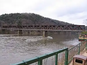 From Clarion Jct., the K&K wound its way through fields and woods just outside Clarion, and then passed through the village of Lucinda. Between 1987 and 2005, the K&K had its rolling stock and locomotives located in the small village Marienville. The trains were eventually moved to Kane in early 2006. Between 1987 and 2004, the railroad ran a tourist railroad from Marienville to Kane, then passed through the borough of Mount Jewett to Kinzua Bridge State Park. The Northern Sub. had its official north end of the line located in Mount Jewett, but the K&K decided to extend the line to the Kinzua Bridge (that was once owned by the Erie Railroad) where the train would take tourists over the viaduct. In 2003, half the viaduct was toppled over by a tornado. The K&K ran the train to the park for another year, but service was ultimately cut, due to the loss of riders wanting to go over the bridge. Another tragedy struck in March 2008. Arsonists set fire to the enginehouse where the locomotives were kept after being moved from Marienville. Later that year, the Knox and Kane was sold at auction, but the stretch of rails operated by the K&K were left in place. Most of the tracks dated back to the 1920s when most of the original 3 ft (914 mm) gauge rail was replaced with 4 ft 8+1⁄2 in (1,435 mm) standard gauge rail on the Northern Subdivision. In the spring of 2010, the Kovalchick Corporation began the long process of removing the rail crossings along state roads between Clarion and McKean counties.[1]
