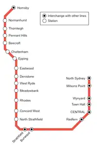 • All stations from Epping to Strathfield, then Redfern, Central, and all stations to Gordon, then all stations to Hornsby.