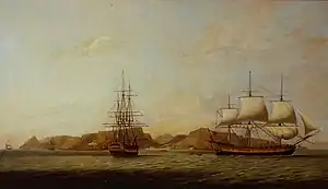 EIC voyage #6 (1795–1797): Captain James Rees was again captain of Northumberland on this, her sixth and last voyage. He acquired a letter of marque 14 April 1795.[4] He sailed from Portsmouth on 24 May 1795, bound for China. She had sailed with a convoy of Indiamen that were bringing General Alured Clarke and his troops for the invasion of the Cape Colony.