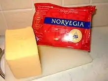 Norvegia (Norwegian pronunciation: [nʊrˈvèːɡɪɑ]; Latin for "Norway") is a Norwegian cow's milk cheese produced by Tine.[1] It has a market share of about 60% of white cheeses in Norway.[2] It is Norway's best-selling cheese.[3] It is similar to Gouda, has a mild taste and melts easily.[2] There are different types of it. It has been produced since the 1890s.[2] Its recipe details remain a trade secret of Tine.
