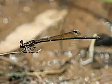 Its usual habitat is near rivers and streams. The adult is a medium-sized damselfly with a length of 35 to 40mm, and wingspan similar to its length. The thorax is black with vivid greenish-blue markings in the male, and pale brown in the female. The abdomen is dark with pale narrow bands between abdominal segments. The wings are tinted with yellow or lemon. In Australia, the distribution is in suitable habitat in the north and eastern part of the continent from the top end of the Northern Territory to central Queensland.[4] The taxon has been assessed in the IUCN Red List as being of Least Concern.