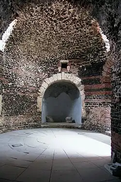 The temple, which is particularly simple in construction, can be compared to the cross-domed typology for the ichnografy. The central body remains of the original structure, a rotunda with a dome covering with two large windows with lowered arch open on the upper part, together with two unequal arms both apsed, oriented to the west and to the south. The first is covered with a barrel vault, the second has a large arched window covered with a half dome. In the construction of the building, parts of the walls of the pre-existing thermal environments were reused. Also in that construction phase, the old Roman aqueduct was also restored, of which a fragment remains outside to the south of the monument. Inside the building, there are a fragment of the Roman canalization and, at a higher level, the remains of the channels from the Byzantine era.[6]