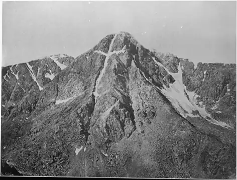 Word of the enormous white cross of snow on Mount of the Holy Cross was first published in 1869 and the historic first photograph of the mountain was taken by William Henry Jackson from Notch Mountain on August 24, 1873, with the assistance of a survey party who carried the heavy photographic equipment.[4][5] In 1874, Thomas Moran sketched Mount of the Holy Cross from the top of Notch Mountain, then later created an oil painting from the sketch.[6] This led to the mountain becoming well-known, and from the late 1920s to the late 1930s people were making frequent pilgrimages to Notch Mountain to see the famous snowy cross on the northeast face of the neighboring mountain. A stone shelter was built on Notch Mountain in 1924 to protect these hundreds of visitors during storms. The shelter is on the National Register of Historic Places in Eagle County, Colorado. The mountain's toponym has been officially adopted by the United States Board on Geographic Names.[2]