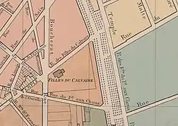The Congregation of Our Lady of Calvary was dissolved in 1790 during the French Revolution, and their property was sold as a national good on Vendémiaire 8, Year V (September 29, 1796). In 1804, the Rue Neuve-de-Bretagne (now Rue Froissard) and Rue Neuve-de-Ménilmontant (now Rue Commines), were established through the site of the former convent, without any permission. They were incorporated into the public road system in 1806.[2] A third street and a passageway, which were planned as a part of the housing estate plan on the site, were not established.[4]