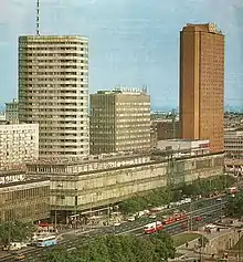 The Hotel Orbis Forum was built from 1972 to 1974, during Poland's communist era, by the state-owned travel monopoly Orbis. The hotel was designed to accommodate foreign visitors, and was managed by the budget Forum Hotels division of Pan Am's InterContinental Hotels chain. The hotel was designed by Swedish architect Sten Samuelson and erected by Swedish construction company Skånska Cementgjuteriet. It was the second tallest building in Poland after the Stalinist Palace of Culture and Science. The hotel opened on January 25, 1974.[1] The building's flat, rectangular shape, with rows of small windows and a brown facade, earned it the nickname giant chocolate bar.[2]