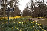 The park and its manor house, Nowton Court, built in 1837, was owned by the Oakes family, headed by Henry Oakes, also lord of the manor of Nowton, from 1837 until his death.[2] Nowton Court is now a nursing home called 'Nowton Court Village'.[3] There is an avenue of lime trees planted around 1880. It offered Nowton Court a view to the northern boundary, in spring over 100,000 daffodils bloom beneath the trees.[4]