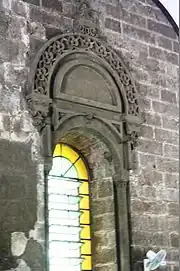 The church is a mixture of different architecture styles. An example of this is the façade which shows Neo-Romanesque-Gothic style.[5] The massive buttresses create a vertical movement, stopped only by the roundness of windows, statues, niches and the semi-circular arch of the main entrance. The missing old monastery to which it was attached on the left sets the façade somehow off balance. Two sets of Doric columns support the cornice and the triangular pediment. Leaf carvings above the main recessed entrance, niches, windows and around the tympanum lightens the massive character of the structure which have touches of the Baroque. A string course of arabesque designs runs along the architrave.[6]