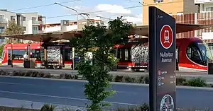 Nullarbor Avenue is a light rail station on the Canberra Metro R1 Civic to Gungahlin line, located at the intersection of Nullarbor Avenue and Flemington Road. The station was a key location during construction and testing of the light rail route[1] and serves the suburbs of Franklin and Harrison. A crossover track is located immediately north of the platforms, making it possible for light rail vehicles to terminate here, however currently all services continue through the station. The station offers bicycle lockers in addition to "kiss and ride" bays, installed around the intersection adjacent to the station.[2]