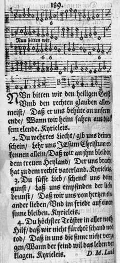 The Protestant reformer Martin Luther issued a liturgy for services in 1523, Formula missae et communionis. One aspect was the inclusion of hymns in German. He recommended, for lack of alternatives, three medieval songs to be sung regularly: "Gott sei gelobet und gebenedeiet", "Ein Kindelein so lobelich" and, probably as the gradual, "Nun bitten wir den Heiligen Geist".[2][5] The leise had a long tradition. Its topics of the right faith (rechter Glaube, veram fide) and the thought of the time of death must have appealed to Luther. He had mentioned veram fide in an early sermon about the leise (1509 or 1510), and promoted salvation by faith alone (sola fide). Anxiety in the hour of death was something that Luther dealt with all of his life, and he was not the only one.[8]