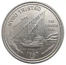 1987 Portuguese escudo coin depicting Nuno Tristão's journey to the Gambia River (sic) in 1446