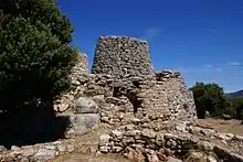 The site is located on a limestone plateau between the towns of Osini and Gairo. The nuragic complex, built over a cave with two entrances, consists of a central tower of 6.3m high flanked by three smaller towers, around which are placed 8 circular huts. Access to the towers is through a small courtyard.
