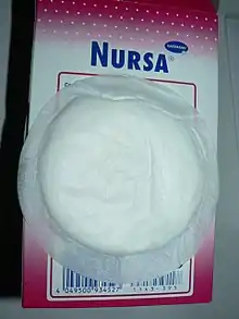 A nursing pad (or breast pad) is a cloth or disposable pad worn against the nipple and breast of a nursing mother to absorb any milk that may leak between feedings. It is inserted between the bra and the breast. Disposable pads are common and located easily online or in specialty stores. Reusable cloth pads can be washed and used over. These may be less expensive. Changing the pad when it is wet will keep the nipple clean and dry.[1]