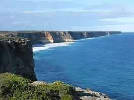 In the southwest the reserve includes the Israelite Plain, a coastal plain with broad beaches, dunes, sandplains, and coastal lagoons which includes Israelite Bay. The middle section of the reserve protects the Baxter Cliffs, dramatic seacliffs that extend up to 80 metres high for over 190 km along the coast. The Baxter Cliffs feature Toolinna Cove and Twilight Cove. The reserve boundary extends northwards near Cocklebiddy to encompass Cocklebiddy Cave on the Hampton Tableland. The eastern end of the reserve includes the western portion of the Roe Plains, with extensive coastal dunes and sandplains. Eyre Bird Observatory is located near Cocklebiddy, where the cliffs transition to the Roe Plains.[2][3][4]