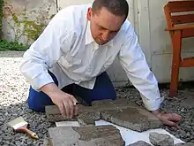 The excavations were organized due to confirmed reports that, upon the news of the outbreak of World War II, historic items were hidden in the synagogue.[3] They were: the account of Yishayahu Yarot, a former resident of Oświęcim, who survived the Holocaust, who described the history of hiding the objects and the story of Leon Schönker, who headed the local Jewish community in the first days of the German occupation. In 1998, when he was 90, Yarot accidentally met Jariv Nornberg, a young Israeli who had just left the army and was about to visit extermination camps in Poland. Then Yarot remembered the moment when he saw people burying what he thought was two metal boxes.[4] He also drew a map to help researchers find hidden objects. The objects were probably hidden on the initiative of the then rabbi of the Great Synagogue, Elyahu Bombach, in the first days of the war, one meter under the floor in the corner of the synagogue, under the stairs leading to women's galleries. They were disassembled before being buried.