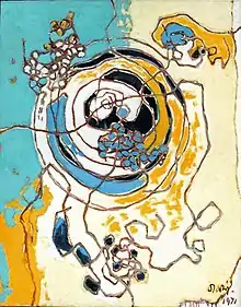 ORAZI's works were, at first, in low relief. One of them, Été (Summer), has been exhibited at the Salon de Mai of 1962, not only in Paris but also in Tokyo, Osaka, and Yawata.[37] Then, the relief became progressively higher, and the shapes extended beyond the limits of the canvas and chassis.[38] They have been annually exhibited at the Salon de Mai, in Paris, from 1962 to 1979, as well as in other exhibitions in France and Europe,[39] among which the ORAZI's solo exhibition of 1966 at the art gallery 'Galerie du Passeur', in Paris. A drawing of the work by ORAZI entitled Alpha-Oméga was reproduced on the invitation brochure to the 1966 exhibition; Alpha-Oméga would also have been exhibited at the Salon de Mai of 1971.[40]