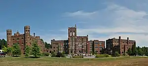 The campus featured a main castle-like building on the top of a hill overlooking the Kennebec River.[9] The main building had three sections: