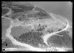 The first major group of settlers arrived in the Chester area from Massachusetts in 1761, and Oak Island was officially surveyed and divided into 32 four-acre lots in the following year. A large part of the island was owned at the time by the Monro, Lynch, Seacombe, and Young families who had been granted the land in 1759. In the early days of British settlement, the island was known locally as "Smith's Island," after an early settler of the area named Edward Smith. Cartographer Joseph Frederick Wallet DesBarres renamed the island "Gloucester Isle" in 1778. Shortly thereafter, the locally used name "Oak Island" was officially adopted for the Island. Early residents included Edward Smith in the 1760s and Anthony Vaughn Sr. in the early 1770s. In 1784, the government made additional land grants, this time to former soldiers, which included parts of Oak Island.[12][13] It was not until July 6, 1818, that the original lot owners' names were mapped for the Nova Scotia Crown Lands office.[14] Oak Island has been intermittently owned by treasure hunters ever since old legends were first published in 1857.[15] The hunt for treasure got so extensive that in 1965 a causeway was built from the western end of the island to Crandall's Point on the mainland, two hundred metres away in order to bring heavy machinery onto the island.[16]