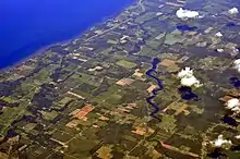 Aerial view of Oak Orchard Creek, 2013. The creek is slightly right of center in the photo, running roughly vertically from the bottom of the image to the lake at top.