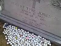 Also resting in the original 6 acres (24,000 m2) is Robert Tyre "Bobby" Jones, an Atlanta-native amateur golfer known for first winning The Double. His grave can always be found with golf balls and other paraphernalia relating to the sport. The immediate area surrounding Jones' grave is adorned by all eighteen flower-bearing plants that are the namesakes of the holes on the Augusta National course. Franklin Garrett, a man dubbed "Atlanta's Official Historian" who extensively cataloged Atlanta's history as well as many of the graves at Oakland and other Atlanta-area cemeteries also rests in the original 6 acres (24,000 m2).