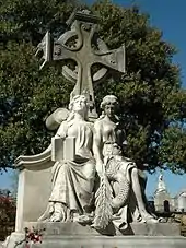 The first thing many people notice when entering the gates of Oakland is the mausoleum of Jasper Newton Smith, on which sits a striking life-size statue of Smith himself. Smith was a businessman and real estate investor who rose to prominence in post-war Reconstruction Era Atlanta. Smith was well known for refusing to wear a necktie due to a bad experience as a child. Therefore, one story describing the creation of his statue notes that when the artist sculpted him wearing a cravat, Smith refused to pay until the offending item had been chiseled off.[2] Another story notes that Smith once travelled to the cemetery to personally remove a vine that had wrapped around the neck of the statue.[3]