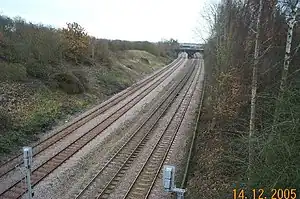 About a mile (2 km) north of the station is the point where the Midland installed its first troughs to allow locomotives to pick up water. The river valley here is very flat, and the line crosses it seven times in the space of about 7 miles (11 km) most prominently on the viaduct (which is two separate viaducts running parallel to each other) to the north of the village. The line is elevated because of problems with flooding. Even the local roads have raised walkways.[3]