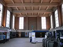 The station building is a fine example of the architecture Charles Holden designed for the Piccadilly line extensions, with a large and imposing box-shaped ticket hall surrounded by lower structures containing shops. The ceiling of the booking hall is particularly monumental and bold. The whole design mirrors proportions found in classical architecture, albeit in a distinctly 20th century structure. The dimensions of the ticket hall are approximately a "double-cube" (its front elevation is roughly twice its height and width). The station is similar to Holden's slightly earlier designs for Sudbury Town and Acton Town stations at the western end of Piccadilly line. Oakwood Station is a Grade II* listed building.[9]