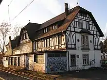 Only two of its many original buildings still exist: the former station master’s house and the entrance building. The Homburg line station now has only two tracks on either side of an island platform. The tracks in the spacious freight yard are now abandoned and largely overgrown, with 200 species of wild flower identified.[7] Parts of the area are used for a parking lot. It is planned to build a new neighborhood on the area. The connection to the U-Bahn network is now blocked by a GSM-R mast. The U-Bahn station consists of a twin-track station with provision for reversal before the line branches off towards Hohemark.