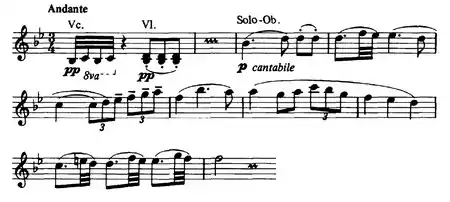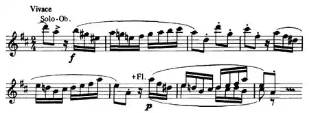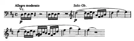 As with his other late works, Strauss builds up the music from a series of small melodic ideas "which are the point of departure for the development of the entire composition."[13] The concerto is built up from three main thematic elements. The first is the 4 semiquavers D–E–D–E which opens the piece in the cellos. The second is a long note (minim) followed a playful figure of shorter durational values (semi-quavers). The third is a repetition short-short-short long followed by different variants of continuations. This motif echoes the rhythm of the Fate motif of Beethoven's Fifth symphony and "clearly refers to Metamorphosen, completed just before the Oboe Concerto – a remarkable example of the thematic links between the last instrumental works".[14] However, it also relates back to Strauss's use of the rhythm of the Fate motif in the first movement of his youthful Piano Sonata written over 60 years earlier in 1881. The finale ends with a surprise: after the second cadenza, Strauss concludes with a dance-like Allegro in 6/8 meter which comes across as a fourth movement with a character of its own.