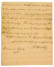 In 1863, six letters from Phillis Wheatley to Obour Tanner were donated to the Massachusetts Historical Society by the wife of William Henry Beecher. Mrs. Beecher stated in an accompanying letter that she had received the letters from Tanner herself.[6] No letters from Tanner to Wheatley have ever been discovered.[9]