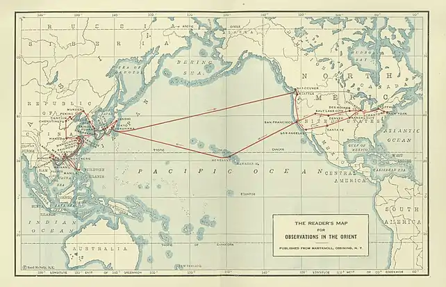 In China, Walsh travels through the main cities of Pecking, Chengtingfu, Hankow, Hangchow, Shanghai, Chusan, Ningpo, Taichowfu, Hong Kong, Canton, Macao, and Sancian. As he travels around China, he meets a similar range of missioners participating in a variety of mission work.[3] Like in the previous nations, he visits orphanages, clinics, churches, schools, and government offices.[3] Additionally, Walsh assess the needs that future Maryknollers may encounter.[3] He writes also on the numerous unique customs that a missioner must get used to.[3] Walsh journeys through the cities of Langson, Hanoi, Haiphong, Hainan, and Manila in Indo-China (mostly Vietnam) and the Philippines.