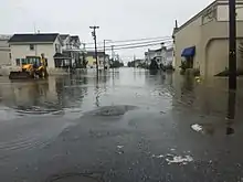 Several days of continuous onshore flow caused significant coastal flooding and beach erosion in New Jersey.[37] The worst erosion took place in Ocean County, specifically around Mantoloking, where 15 ft (4.6 m) of sand was washed away; Ortley Beach saw up to 10 ft (3.0 m).[38] Wind gusts up to 62 mph (100 km/h)—the highest observed winds in relation to the nor'easter—were measured at Cape May.[15] Coastal flooding in New Jersey destroyed at least one home.[10] Stone Harbor sustained millions of dollars in damage to the beach.[37] At least 3,600 residences lost power in the state.[39] Despite severe coastal erosion, structural damage was limited.[38]