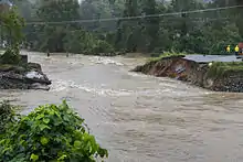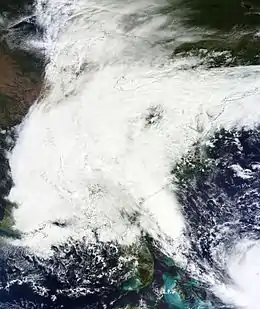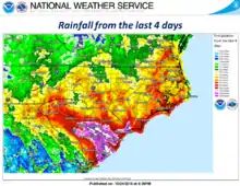 The October 2015 North American storm complex was an extratropical storm that triggered a high precipitation event, which caused historic flash flooding across North and South Carolina. The incipient cold front traversed the Eastern United States on September 29–30, producing heavy rain in multiple states. The system subsequently stalled just offshore. Tapping into moisture from the nearby Hurricane Joaquin, a developing surface low brought heavy, continuous rain to southeastern States, with the worst effects concentrated in South Carolina where catastrophic flooding occurred. The event culminated in South Carolina on October 4 when numerous rivers burst their banks, washing away roads, bridges, vehicles, and homes. Hundreds of people required rescue and the state's emergency management department urged everyone in the state not to travel.[4] Some areas of the state saw rainfall equivalent to a 1-in-1000-year event.