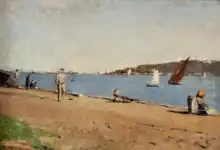 Algés Beach, Oeiras, oil on wood, by João Vaz. Private collection. (c. 1900)
